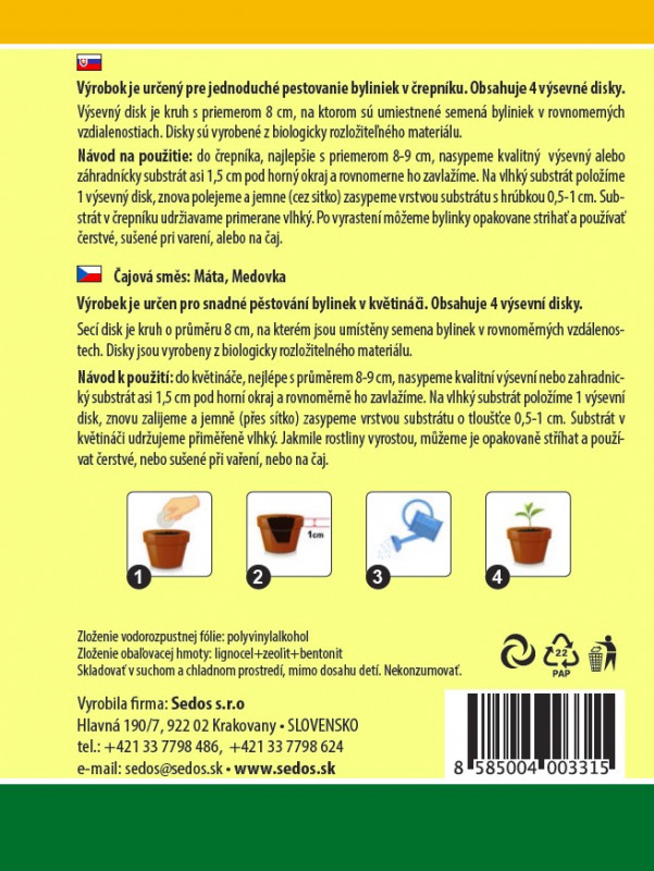 Výrobok je určený pre jednoduché pestovanie byliniek v črepníku. Obsahuje 4 výsevné disky.
