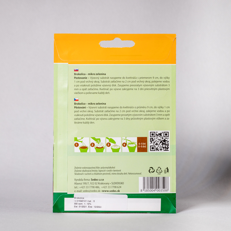 Microgreens Brokolica – je mikro zelenine určená na pestovanie klíčnych rastliniek, ktorú po vyklíčení a vyrastení približne na 5-6 cm ostriháme a použijeme na chlebík, alebo ako prílohu do šalátu, či k mäsu.